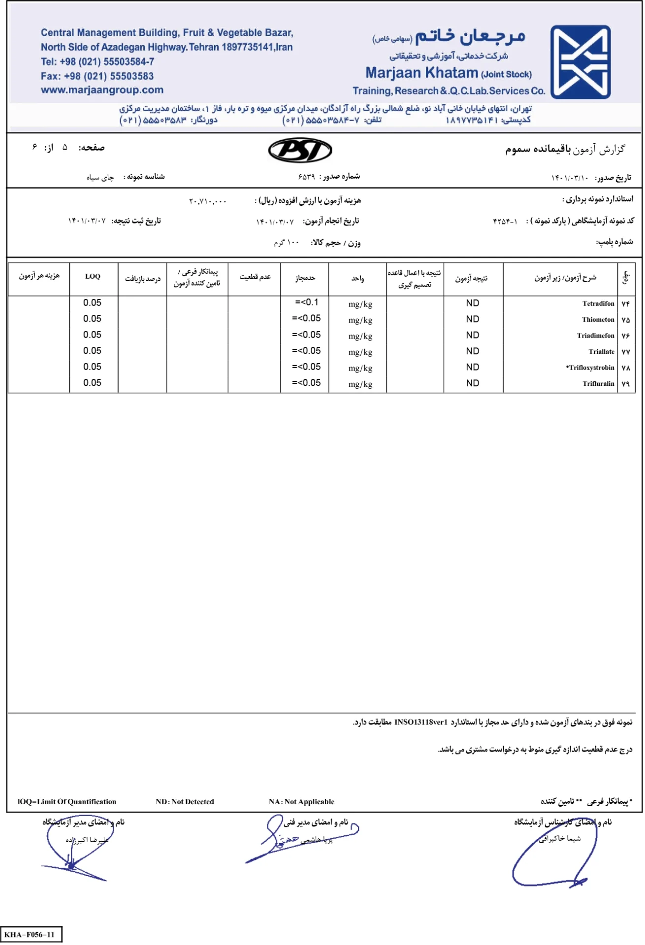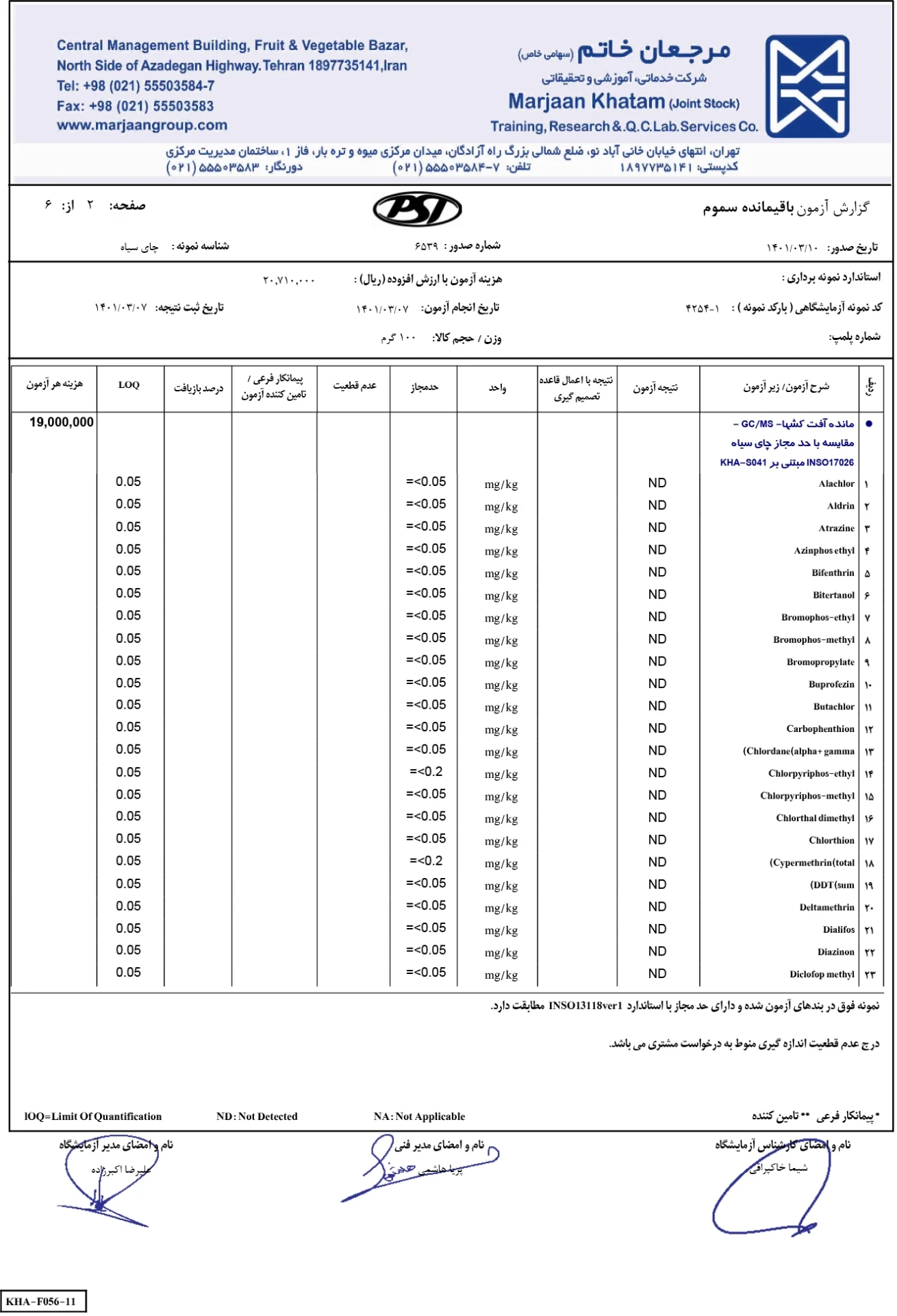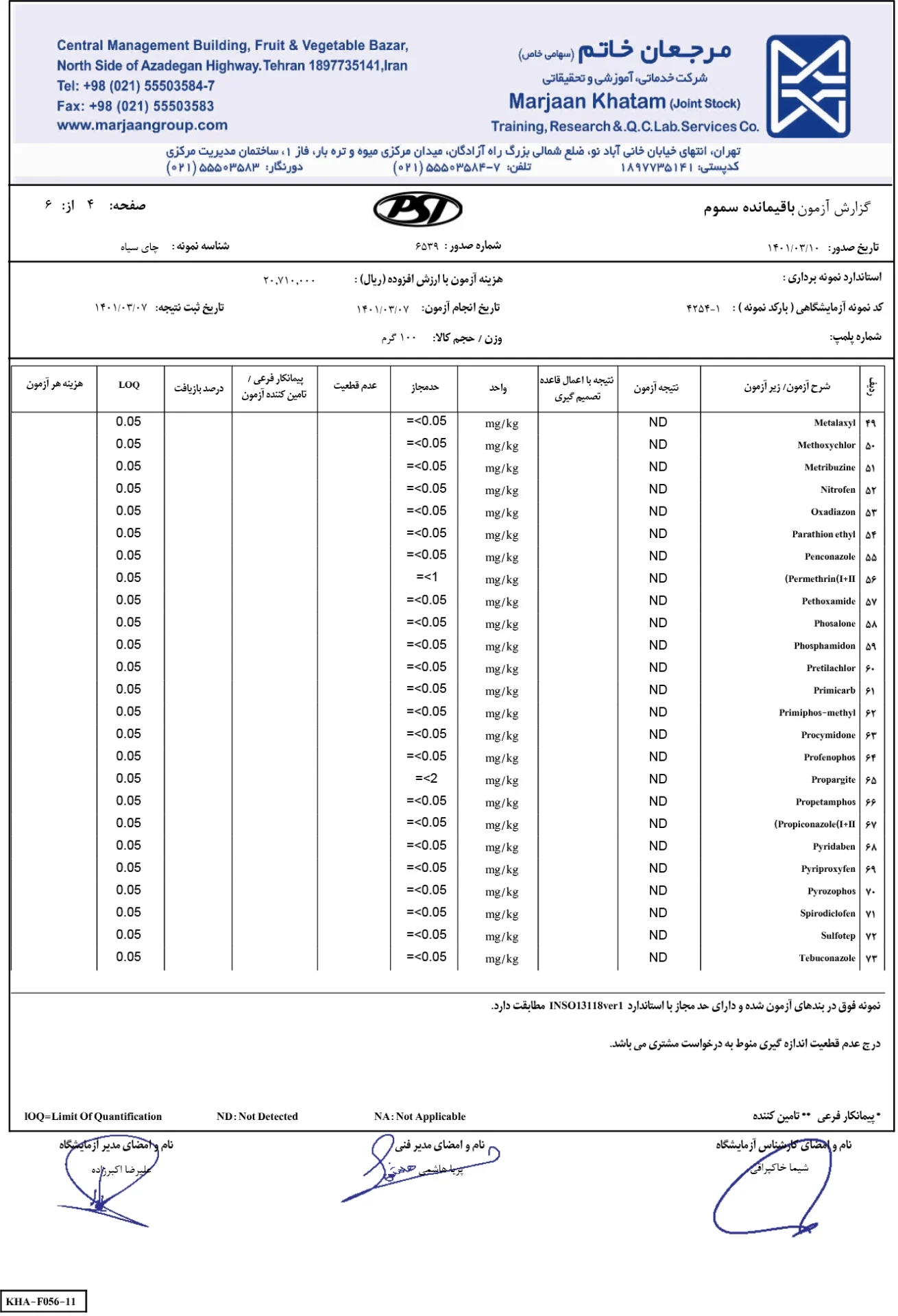 ۱) عدم وجود درصدی (حتی به اندازهی مجاز) باقیمانده سم شیمیایی از میان ۲۹ نوع سم شیمیایی رایج مورد آزمایش قرار گرفته.